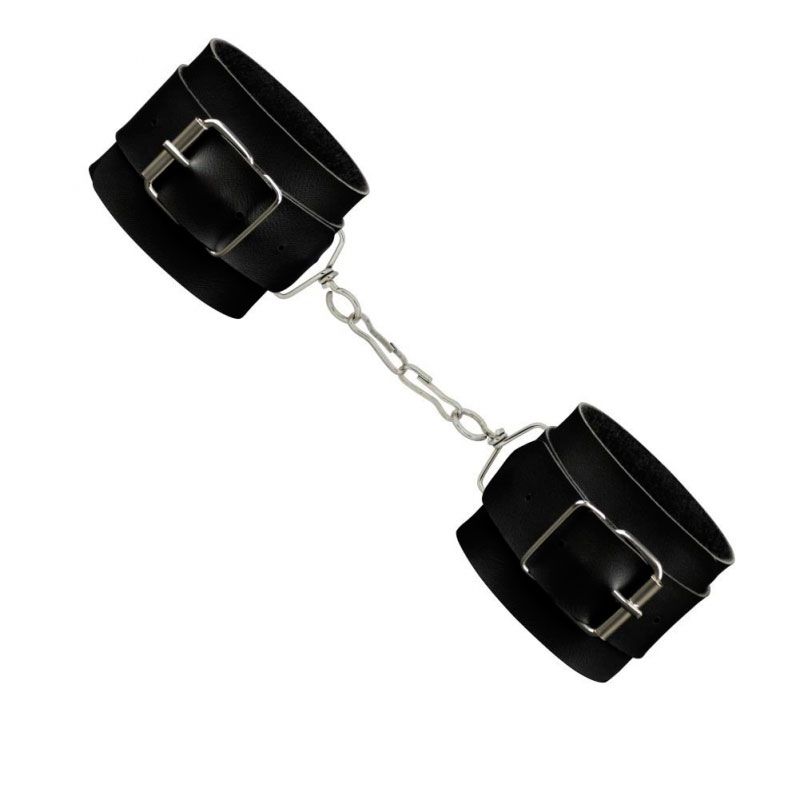 Algemas confeccionadas em material sintético semelhante ao couro e revestimento interno aveludado, seu tamanho é ajustável e regulável de acordo com suas medidas de pulso para garantir conforto. Detalhes de fivelas, fechos e travas em metal niquelado que dão o tom masoquista ao produto.